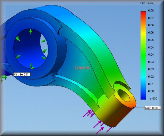 Left: solid mesh with boundary conditions - green arrows show the fixed constraint at the rocker shaft bore, pink arrows show the valve spring load at the pad end. Right: URES resultant displacement plot - maximum deflection 0.06 mm at the valve end under full spring load at 8,500 rpm. The colour gradient from blue to orange-red identifies where the rocker is working hardest and where material can safely be removed. Click either image to expand and zoom.