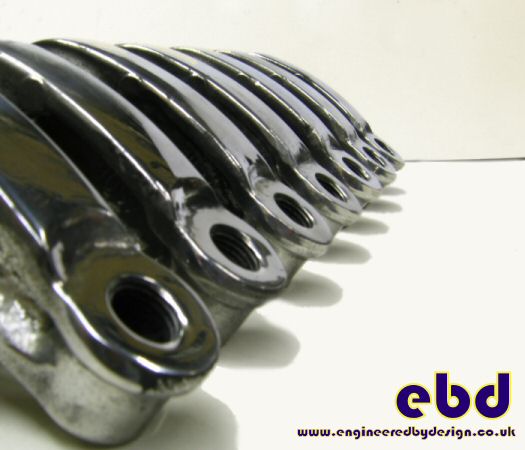 The finished modified rockers. Material removed from low-stress regions identified by FEA, section transitions blended to remove stress raisers. The polished surface finish is not cosmetic - surface condition directly affects fatigue life on a cyclically loaded component. Click to expand.